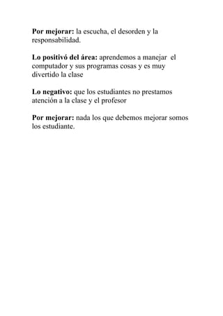 El resumen evalúa el segundo periodo académico, señalando que el profesor es razonable y les da más tiempo a los estudiantes, pero a veces es incomprensivo cuando los estudiantes abusan de su confianza. Los estudiantes son a veces colaboradores y respetuosos, pero también son desordenados, irresponsables e inatentos. El área es positiva porque enseña computación, pero los estudiantes no prestan atención.