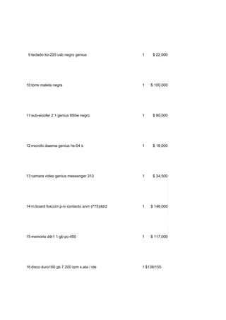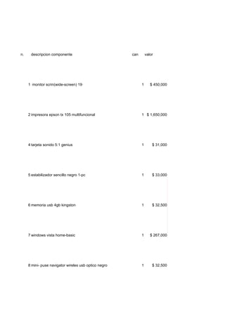 Este documento lista 21 componentes de computadora con sus descripciones, cantidades y precios. Algunos de los componentes incluyen un monitor de 19 pulgadas por $450,000, una impresora multifuncional Epson por $1,650,000, y una tarjeta de sonido 5.1 Genius por $31,000.