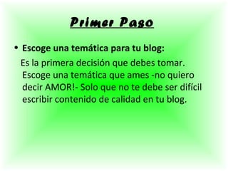 El documento proporciona 7 pasos para crear un blog exitoso: 1) Escoger una temática interesante; 2) Escoger un nombre relacionado a la temática; 3) Escoger una plataforma de blogs como Blogger o WordPress; 4) Escoger una plantilla atractiva; 5) Establecer una frecuencia de publicación regular; 6) Participar activamente en otras comunidades de blogs; 7) Escribir artículos interesantes y de calidad.