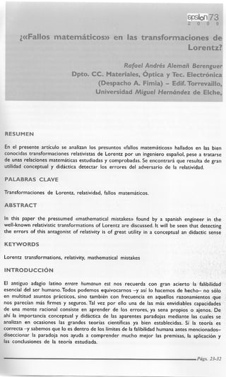 Los supuestos fallos matemáticos de las tramsformaciones de Lorentz según el ingeniero Juan Alberto Morales