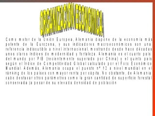 Alemania tiene tres grandes regiones: una llanura en el norte, una meseta en el centro y una región montañosa en el sur. Tiene un clima templado húmedo. Sus principales ríos son el Rin, Elba y Danubio. La economía se basa en la industria, especialmente la automovilística y química. La población alemana es de aproximadamente 83 millones de habitantes.
