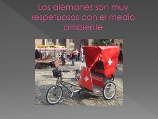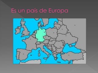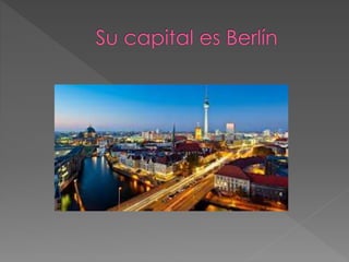 Este documento lista varios lugares, eventos y personas importantes de Alemania. Menciona sitios históricos como la Catedral de Berlín, la Puerta de Brandeburgo y el Muro de Berlín, así como ríos como el Danubio y el Rin. También habla de castillos como Neuschwanstein, festivales como el Carnaval de Colonia y la Oktoberfest, y figuras culturales destacadas como los Hermanos Grimm, Einstein, Beethoven y Gutenberg.