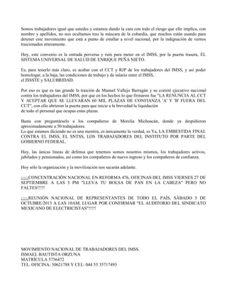 El documento es un boletín de la Alerta Nacional de los Trabajadores del IMSS que hace las siguientes aclaraciones: (1) El SNTSS está tratando de confundir a los trabajadores negando los cambios al CCT, pero ya se firmó un convenio que incorpora cambios perjudiciales; (2) Este convenio fue firmado sin autoridad y acabará con el CCT y RJP; (3) Se debe centrar la atención en exigir un desmentido oficial del director del IMSS sobre estos cambios perjudiciales.