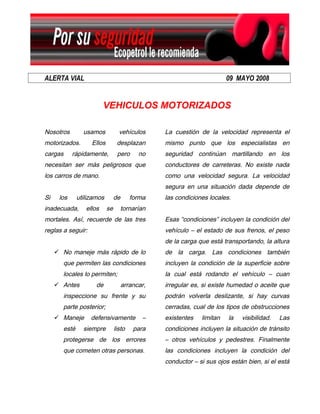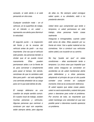 El documento habla sobre la importancia de conducir de manera segura y defensiva. Recomienda tres reglas clave: 1) no exceder los límites de velocidad permitidos según las condiciones, 2) inspeccionar el vehículo antes de conducir para asegurarse de que es seguro, y 3) conducir de manera defensiva anticipándose a los posibles errores de los demás. También enfatiza que la velocidad segura depende de las condiciones de la carretera, el vehículo, el tráfico y el