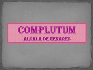 La ciudad romana de Complutum, ahora conocida como Alcalá de Henares, se originó en el siglo II a.C. cuando los romanos conquistaron la región. En el siglo I a.C. ya se mencionaba a Complutum como un importante nudo de comunicaciones con 23 calzadas. La ciudad floreció durante los imperios de Augusto y los Antoninos debido a su valor militar y estratégico. Las excavaciones han revelado restos del foro romano como una basílica, curia y edificios termales, así como viviendas decoradas con mosaicos
