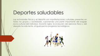 El documento habla sobre deportes saludables. Menciona que las actividades físicas y el deporte son parte importante de la cultura de los grupos y sociedades. Luego enumera ejemplos de deportes saludables como squash, remo, escalada, natación y esquí de fondo. Explica que hacer deporte regularmente trae beneficios para la salud como mantener un peso saludable, mejorar la calidad del sueño y reducir el estrés. Finalmente, proporciona más detalles sobre squash, incluyendo su puntaje de saludabilidad según