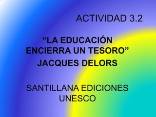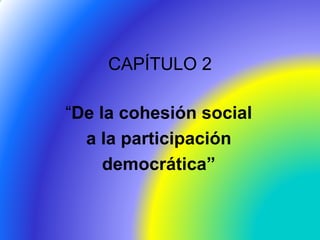 El documento discute el papel de la educación en la sociedad y cómo puede fortalecer la cohesión social y la participación democrática. Señala que la educación debe respetar la diversidad y luchar contra la exclusión para forjar una identidad común. También destaca la importancia de enseñar valores democráticos como la tolerancia y el respeto por los demás para construir una sociedad responsable y solidaria.
