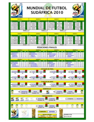 El documento presenta los resultados del Mundial de Fútbol de Sudáfrica 2010, incluyendo los grupos, posiciones finales, octavos de final, cuartos de final, semifinales, tercer puesto y final. Brasil ganó el grupo G, España ganó el grupo H, y España derrotó a Brasil 1-2 en la final para ganar su primer título mundial desde 1950.
