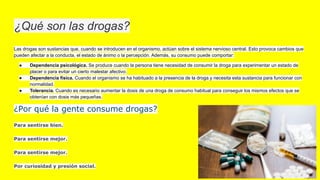 El documento resume los peligros de las drogas, el alcoholismo, la prostitución y el mal uso del celular. Explica que las drogas afectan el sistema nervioso central y pueden causar dependencia psicológica y física, así como tolerancia. Define el alcoholismo como una enfermedad crónica con síntomas de abstinencia y factores biológicos, psicológicos y sociales. También describe la prostitución como relaciones sexuales a cambio de dinero y los riesgos del uso excesivo del celular como distractor en el a