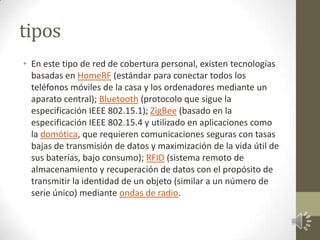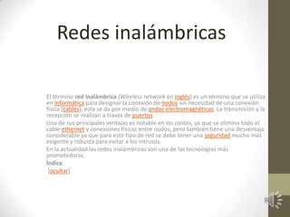 Las redes inalámbricas permiten la conexión de nodos sin necesidad de cables mediante ondas electromagnéticas transmitidas y recibidas a través de puertos. Presentan ventajas de costo al eliminar cables, pero requieren mayor seguridad para evitar intrusos. Actualmente son una de las tecnologías más prometedoras para conectar dispositivos de forma inalámbrica.