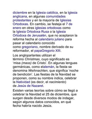 El documento describe la Navidad, una de las festividades más importantes del cristianismo que conmemora el nacimiento de Jesucristo. Se celebra el 25 de diciembre en la mayoría de iglesias, aunque algunas iglesias ortodoxas la festejan el 7 de enero. La Navidad tiene su origen en el cristianismo en el siglo IV y actualmente es celebrada internacionalmente.