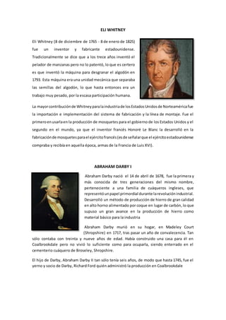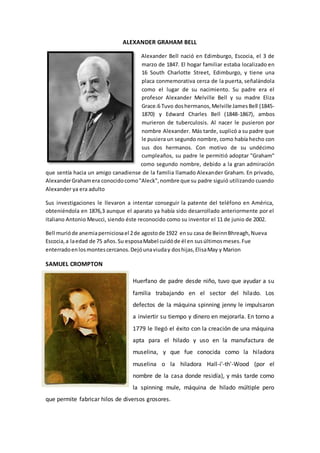 El documento presenta información sobre importantes inventores e innovadores tecnológicos de los siglos XVIII y XIX como Alexander Graham Bell, Samuel Crompton, Eli Whitney, Abraham Darby I, Rudolf Diesel y Thomas Alva Edison. Se describe brevemente sus principales inventos e innovaciones, como el teléfono, la máquina de hilar algodón, el uso del coque en los altos hornos y el motor de combustión interna. También se mencionan las Primera y Segunda Revoluciones Industriales en las que se enmarcan muchas de estas innovaciones tecnol