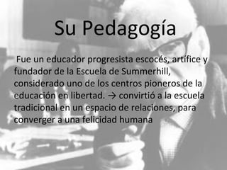 Alexander Neill fue un educador progresista escocés del siglo XX que fundó la Escuela de Summerhill, considerada pionera de la educación en libertad. Neill creía que los niños deberían tener libertad para elegir qué y cómo aprender a su propio ritmo, y que el papel del docente era acompañar el proceso sin interferir para educar hacia una vida feliz enfocada en la dimensión emocional por sobre la racional.