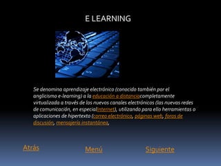 El documento define tres tipos de aprendizaje: e-learning, que se refiere a la educación completamente virtual a través de Internet y herramientas en línea; b-learning, que combina la educación a distancia y presencial complementando el aprendizaje; y m-learning, que se centra en el aprendizaje con dispositivos móviles para que los estudiantes puedan aprender en cualquier lugar y momento.