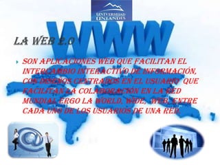 El documento habla sobre la web 2.0 y su importancia para la docencia universitaria. Explica que la web 2.0 facilita el intercambio interactivo de información entre usuarios a través de diseños centrados en el usuario y herramientas de colaboración como wikis y blogs. También menciona que los blogs podrían ser útiles para que los profesores interactúen y se comuniquen constantemente con los estudiantes sobre las tareas.
