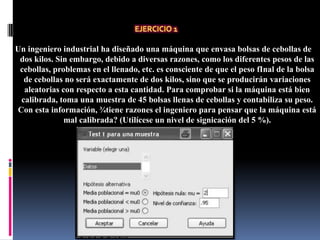 El ingeniero diseñó una máquina para envasar bolsas de cebollas de 2 kg. Tomó una muestra de 45 bolsas y analizó su peso promedio para verificar si la máquina estaba calibrada correctamente. Realizó una prueba t para muestras individuales y encontró que el valor p era mayor al 5%, por lo que no había evidencia suficiente para rechazar la hipótesis nula de que el peso promedio era 2 kg.