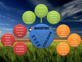 El documento describe a un maestro que se preocupa por sus alumnos y tiene su respeto y cariño. Aunque a veces no está preparado para todas las situaciones, es apreciado por la organización educativa y la gente acude a él para que eduque a sus hijos.