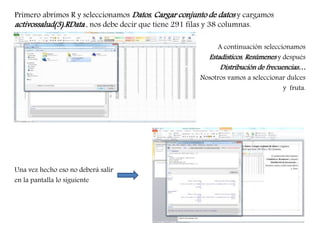 Este documento describe un seminario sobre el análisis de datos de consumo de dulces y fruta. Se cargan los datos y se analizan las frecuencias de consumo, encontrando que se consume más fruta que dulces a diario y que el 25% de la muestra consume dulces 1-2 veces por semana. Luego se resumen variables cuantitativas como altura y peso, describiendo estadísticos como la media, desviación estándar, rango intercuartílico y cuartiles.