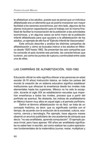 Este documento describe las campañas de alfabetización que ha habido en México desde 1920 hasta 1982. Explica que desde el porfiriato se veía el analfabetismo como un problema que el Estado debía resolver. Detalla las seis principales campañas de alfabetización que ha habido en el país, comenzando con la campaña impulsada por José Vasconcelos en 1920-1922 y finalizando con la campaña durante el gobierno de López Portillo en 1981 con la creación del INEA. Además, analiza que a pesar de los esfuerzos
