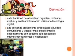 La alfabetización digital es la habilidad para localizar, organizar, entender, evaluar y analizar información utilizando tecnología digital, lo que permite a las personas comunicarse y trabajar más eficientemente especialmente con aquellos que poseen los mismos conocimientos y habilidades. El alfabetismo digital ayuda a obtener seguridad económica y a mantenerse al día con las tendencias sociales, y a menudo se requiere que los educadores tengan certificados de alfabetismo digital.