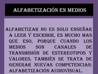 Este documento discute la importancia de la alfabetización en medios y la alfabetización audiovisual más allá de solo enseñar a leer y escribir. Sugieren que cuando los medios transmiten estereotipos y valores, es necesario generar nuevas competencias para analizarlos críticamente. También explora cómo la educación puede ayudar a los jóvenes a pensar críticamente sobre la influencia de los medios y desarrollar inteligencias históricas.