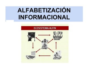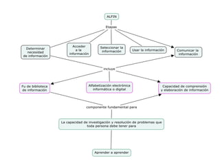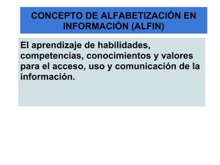 Este documento describe el concepto de alfabetización informacional (ALFIN) como el aprendizaje de habilidades, competencias, conocimientos y valores para acceder, usar y comunicar información de manera efectiva. Explica que una persona alfabetizada en información puede identificar sus necesidades de información, aprender de manera independiente y desarrollar habilidades para encontrar, analizar, sintetizar y comunicar información. Además, integra varias alfabetizaciones como la bibliotecaria, computacional, medial, tecnológica, ética y