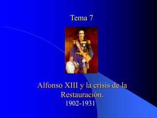 Este documento resume la evolución política en España durante el reinado de Alfonso XIII entre 1902 y 1931. Se divide en dos partes principales: la primera analiza el periodo entre 1902 y 1914 caracterizado por la inestabilidad política y los intentos de regeneración del sistema. La segunda parte examina el periodo entre 1914 y 1923 marcado por la crisis del parlamentarismo debido al impacto de la Primera Guerra Mundial y la crisis de 1917 que puso de manifiesto los problemas del país.