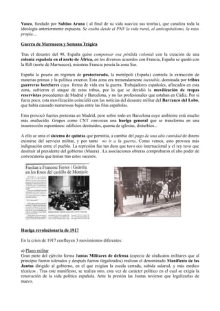 El documento resume el contexto político y social en España durante el reinado de Alfonso XIII desde 1902 hasta 1917. La crisis del sistema bipartidista favoreció el surgimiento de partidos antisistema como los republicanos y socialistas, así como los nacionalismos catalán y vasco. La guerra en Marruecos y la Semana Trágica en Barcelona en 1909 aumentaron la inestabilidad. Finalmente, en 1917 hubo una huelga general revolucionaria que fracasó debido a la represión militar, en medio de tensiones entre las Juntas Militares, fuerzas