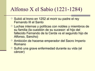 Alfonso X el Sabio subió al trono en 1252 tras la muerte de su padre Fernando III el Santo. Gobernó durante un periodo de luchas internas y ambicionó ser emperador del Sacro Imperio Romano. Promovió importantes proyectos legislativos y científicos, incluyendo las Siete Partidas y las Tablas Alfonsíes, y patrocinó traducciones que ayudaron al crecimiento del castellano como lengua culta.