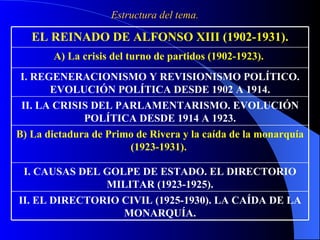 El documento resume la evolución política de España durante el reinado de Alfonso XIII desde 1902 hasta la caída de la monarquía en 1931. Describe la inestabilidad política y la crisis del sistema de turno de partidos entre 1902 y 1923, los intentos regeneracionistas fallidos, el aumento de los movimientos nacionalistas y las luchas sociales, y los factores que llevaron al golpe militar de Primo de Rivera en 1923 y la posterior caída de la monarquía.