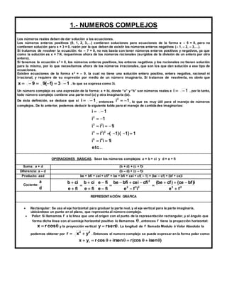 1. El documento introduce los números complejos, que son necesarios para resolver ecuaciones cuya solución no puede expresarse con números reales. Un número complejo está formado por una parte real y otra imaginaria de la forma a + bi, donde a y b son números reales y i = -1.