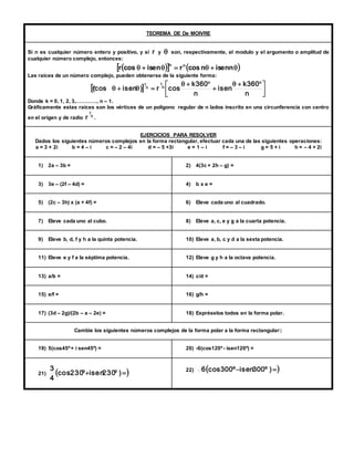 2. Se definen operaciones básicas como suma, resta, multiplicación y división de números complejos. También se explican formas de representarlos gráficamente de manera rectangular y polar.