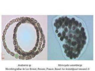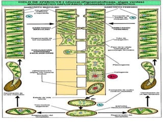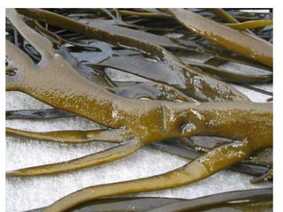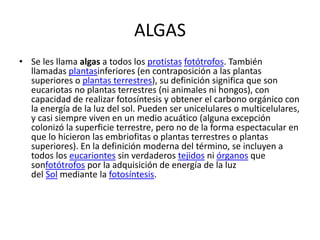 Las algas son protistas fotótrofos eucariotas que realizan fotosíntesis, predominando en medios acuáticos. El fitoplancton, que incluye microalgas procariotas y eucariotas, puede experimentar floraciones algales, aumentando su biomasa en cortos periodos. La 'llaska', un alga comestible del Lago Titicaca, tiene valor nutricional y se utiliza en la gastronomía local, destacando su capacidad para estimular la producción de mielina.