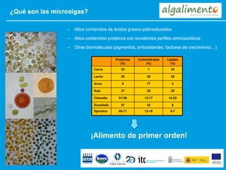 Las microalgas son un alimento de primer orden con altos contenidos de proteínas, ácidos grasos y otros nutrientes. El documento propone desarrollar una planta de producción de microalgas en Canarias para aprovechar sus ventajas como cultivo y generar productos alimenticios innovadores de manera sostenible. El objetivo es alcanzar la escala industrial para satisfacer la demanda mundial creciente de compuestos de microalgas.