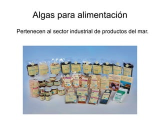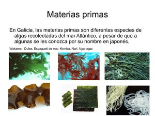 El documento describe las algas utilizadas como alimentos en Galicia, España. Se recolectan varias especies de algas del Atlántico, como el wakame, dulse y kombu. Las algas son ricos en minerales, proteínas, vitaminas y fibra, pero bajos en grasa. Se elaboran mediante deshidratación, enlatado o salazón. Aunque tradicionalmente se usaban como fertilizantes en Galicia, ahora se consumen comúnmente y tienen un futuro prometedor debido a sus propiedades nutricionales.