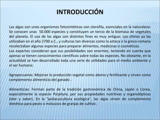 El documento describe los diversos usos de las algas, incluyendo como fuente de biocombustible. Las algas tienen un alto potencial para producir biodiésel y otros biocombustibles debido a su alta productividad (hasta 250 veces más aceite por hectárea que la soja). Investigadores de todo el mundo están desarrollando métodos para cultivar algas a gran escala y convertir su biomasa en biocombustibles como una alternativa renovable a los combustibles fósiles.