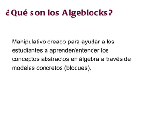 Los Algeblocks son un manipulativo para ayudar a estudiantes a entender conceptos abstractos de álgebra a través de modelos concretos. Pueden usarse para sumar, restar, multiplicar, dividir y factorizar polinomios, así como para completar al cuadrado. Al completar al cuadrado, se añade el mismo término al lado izquierdo y derecho para formar un cuadrado perfecto y así hallar la solución.