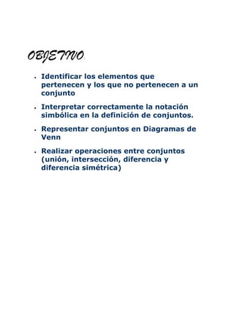Este documento define conceptos básicos de teoría de conjuntos como qué es un conjunto, elementos de un conjunto, representación de conjuntos, diagramas de Venn y ejemplos de operaciones entre conjuntos como unión, intersección y diferencia. Explica que un conjunto es una colección de objetos bien definidos y que pueden representarse de forma extensiva o comprensiva. También describe símbolos y notación para representar conjuntos y realizar operaciones entre ellos.