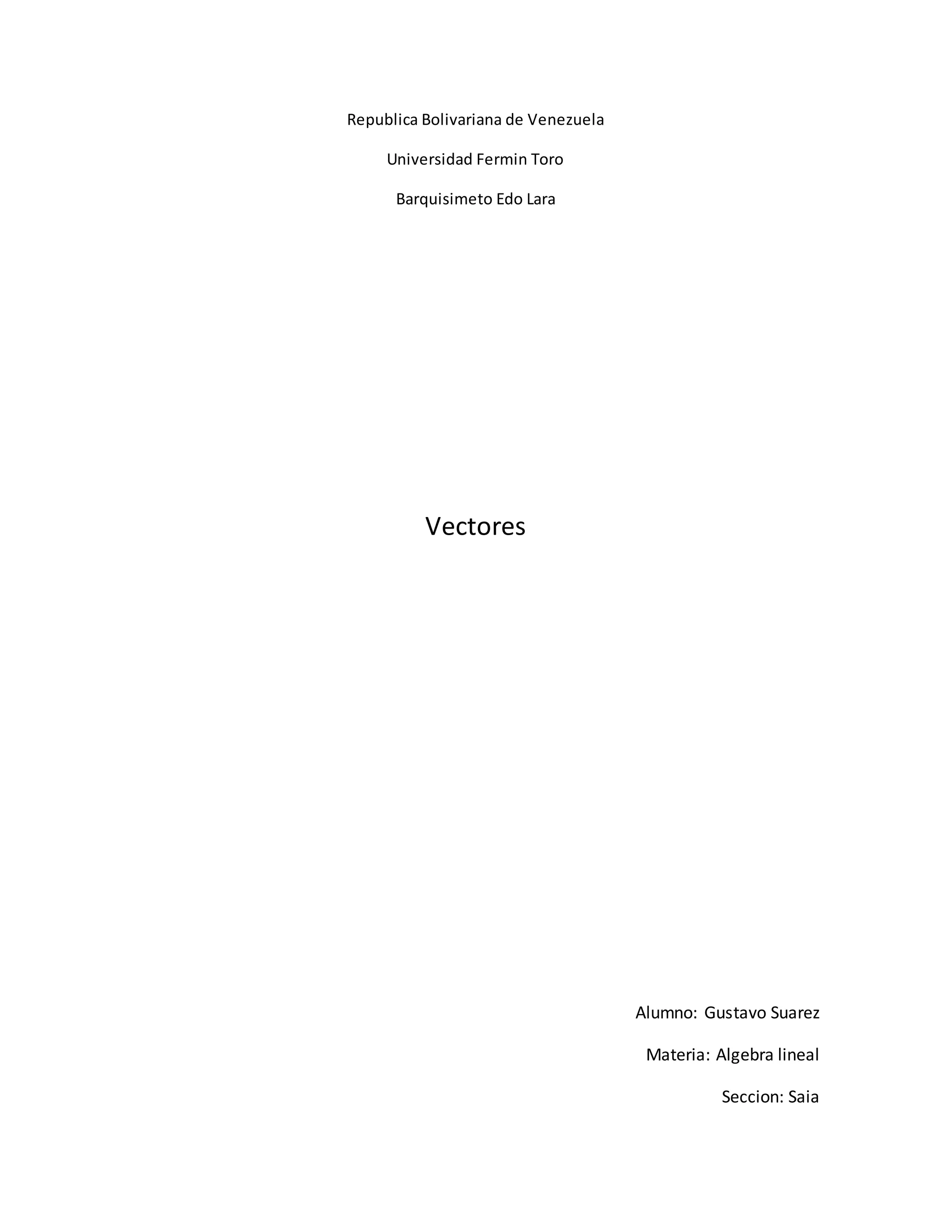 El documento es un trabajo de un estudiante de la Universidad Fermín Toro en Barquisimeto, Venezuela. Trata sobre vectores y pertenece a Gustavo Suárez para la materia de Álgebra lineal en la sección Saia.
