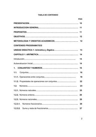 Este documento presenta un módulo de matemáticas básicas desarrollado por la Universidad Nacional Abierta y a Distancia de Colombia. El módulo contiene 14 capítulos que cubren temas de aritmética, álgebra, razonamientos y proporciones, y geometría plana y espacial. El objetivo es preparar a los estudiantes con conocimientos básicos de matemáticas para carreras universitarias. Incluye introducciones a los temas, ejercicios de autoevaluación y secciones de g