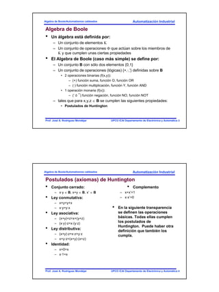 Este documento introduce el álgebra de Boole y sus aplicaciones en la automatización industrial. Explica las operaciones básicas del álgebra de Boole como la suma, el producto y la negación. También describe cómo modelar sistemas físicos mediante variables booleanas y funciones lógicas, y cómo simplificar expresiones lógicas utilizando propiedades del álgebra de Boole. Finalmente, muestra cómo implementar circuitos lógicos mediante puertas como AND, OR y NOT para controlar dispositivos en una planta industrial.