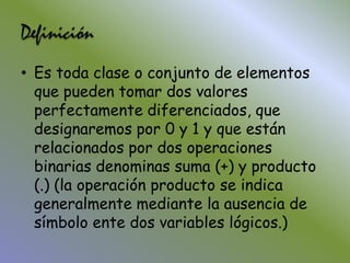 La algebra de Boole define elementos binarios que toman valores 0 y 1 y operaciones como suma y producto. Describe puertas lógicas como AND, OR, NOT que realizan funciones booleanas y pueden usarse para implementar cualquier función lógica. Explica que conjuntos de puertas como AND, OR, NOT o solo NAND o NOR son completos para implementar cualquier función.