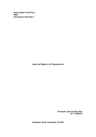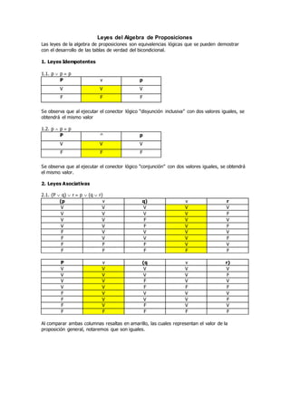 Este documento resume las leyes fundamentales del álgebra de proposiciones, incluyendo leyes idempotentes, asociativas, conmutativas, distributivas, de identidad, de complementación y de Morgan. Se demuestran cada una de las leyes utilizando tablas de verdad para mostrar que ambos lados de cada equivalencia lógica siempre tienen el mismo valor de verdad.