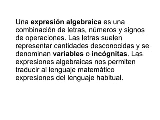 Una expresión algebraica es una combinación de letras, números y signos de operaciones que representan cantidades desconocidas. Las letras representan variables o incógnitas. El lenguaje algebraico permite expresar información de forma concisa utilizando variables. Existen diferentes tipos de expresiones como monomios, polinomios, ecuaciones e identidades.