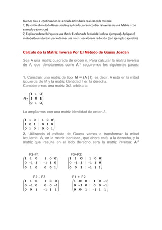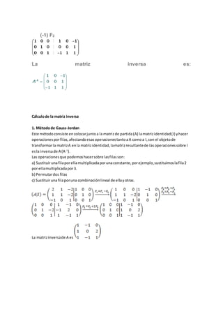El documento describe el método de Gauss-Jordan para calcular la inversa de una matriz y obtener una matriz escalonada reducida. Explica que el método de Gauss-Jordan consiste en colocar la matriz junto a la identidad e igualarla mediante operaciones de filas, obteniendo la inversa en la mitad derecha. También define qué es una matriz escalonada y escalonada reducida, dando ejemplos de cada una.