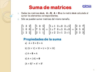 Este documento presenta conceptos básicos sobre matrices, incluyendo su definición como una tabla de números con filas y columnas, el producto de una matriz por un escalar, propiedades del producto matricial como la no conmutatividad y la distributividad, diferentes tipos de matrices como matrices fila, columna, nula, triangular, identidad y escalar. También explica el determinante de una matriz cuadrada como un escalar calculado usando cofactores y presenta algunas de sus propiedades. Finalmente, da ejemplos de cómo calcular determinantes de matrices de orden 1