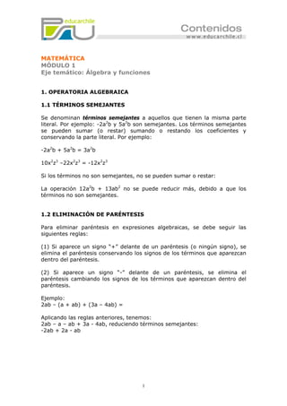 Este documento presenta conceptos básicos de álgebra y funciones. Explica operaciones algebraicas como sumar términos semejantes, eliminar paréntesis, multiplicar expresiones algebraicas incluyendo monomios, binomios y polinomios, y productos notables. También cubre factorización de expresiones algebraicas y resolución de ecuaciones de primer grado incluyendo ecuaciones literales. Proporciona ejemplos para ilustrar cada concepto.