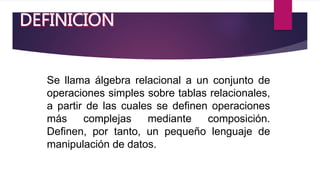 El documento describe las operaciones básicas del álgebra relacional, incluyendo selección, proyección, producto cartesiano, unión, unión natural e intersección. Define el álgebra relacional como un conjunto de operaciones algebraicas que operan sobre tablas y devuelven tablas como resultado, las cuales se pueden combinar para expresar consultas a bases de datos relacionales. También menciona que todas las operaciones del álgebra relacional se pueden expresar en SQL.