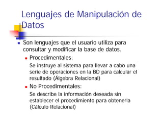 Este documento describe los lenguajes de manipulación de datos, que son lenguajes que permiten consultar y modificar bases de datos. Explica los tipos de lenguajes (procedimentales y no procedimentales), su evolución histórica, y describe operadores relacionales como selección, proyección, unión, diferencia, producto cartesiano y renombre.