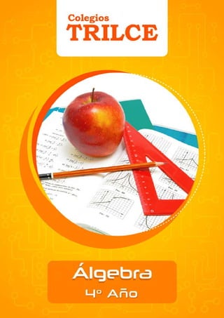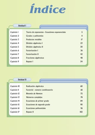 El documento abarca una amplia variedad de temas de álgebra, organizados en capítulos que incluyen exponentes, polinomios, ecuaciones, funciones, logaritmos y matrices. Cada capítulo presenta conceptos teóricos junto con ejercicios prácticos para reforzar el aprendizaje. Los contenidos están dirigidos a estudiantes de cuarto año de secundaria, con un enfoque en el desarrollo de habilidades matemáticas fundamentales.
